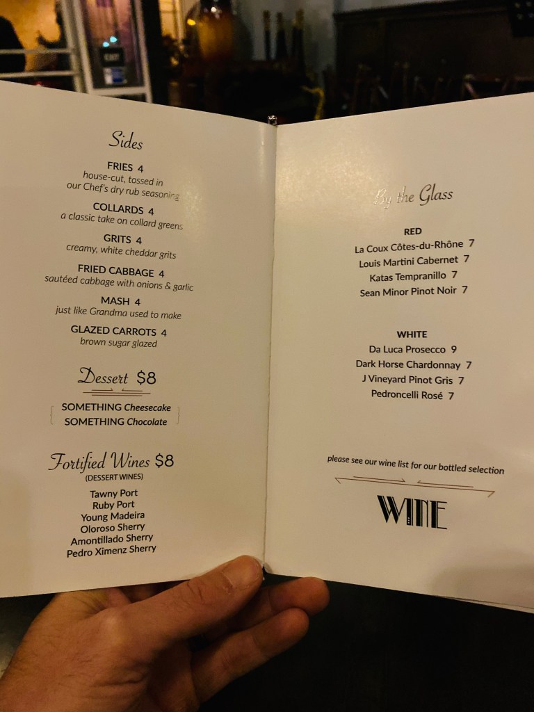 As I pick up the menu my eye goes straight to Foie Gras and a whisky drink that includes a sassafras infusion and I am in! I will take that and that please as I point to the two best thing on the menu, though I don’t know it at the time.