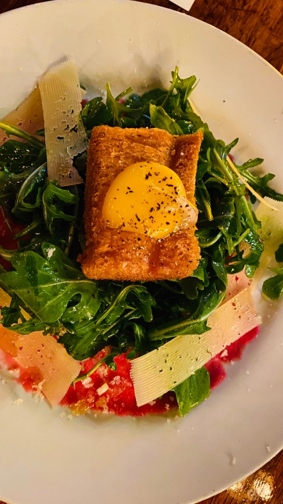 So I am a huge fan of raw filet and arugula so I order the carpaccio. Way to much salt, I think the chef got excited about his new salt flakes and went a little cray cray. It is a simple mistake and anyone could make it. I also feel a little too much truffle oil was used. The person that garnished this dish was probably a young and excited chef, nothing wrong with excitement, but you can go to much with such rich ingredients. The arugula salad was Devine, but I am an arugula fan all the way. The bread basket was unique and delicious unexpected treat. It was a light fluffy piece of toast with a raw egg yolk in the middle. The golden toast bar melted in your mouth and the egg would have been so good on the beef, what a fun concept that I will definitely have fun recreating at one of my next private dinners. Thank you team for the effort, I will definitely try again and specify light on the salt. To be fair, the waitress noticed I didn’t eat much and took this item off my bill. She said the chef agreed there was too much salt. Mistake made, chef was aware, problem solved, now on to the next course.