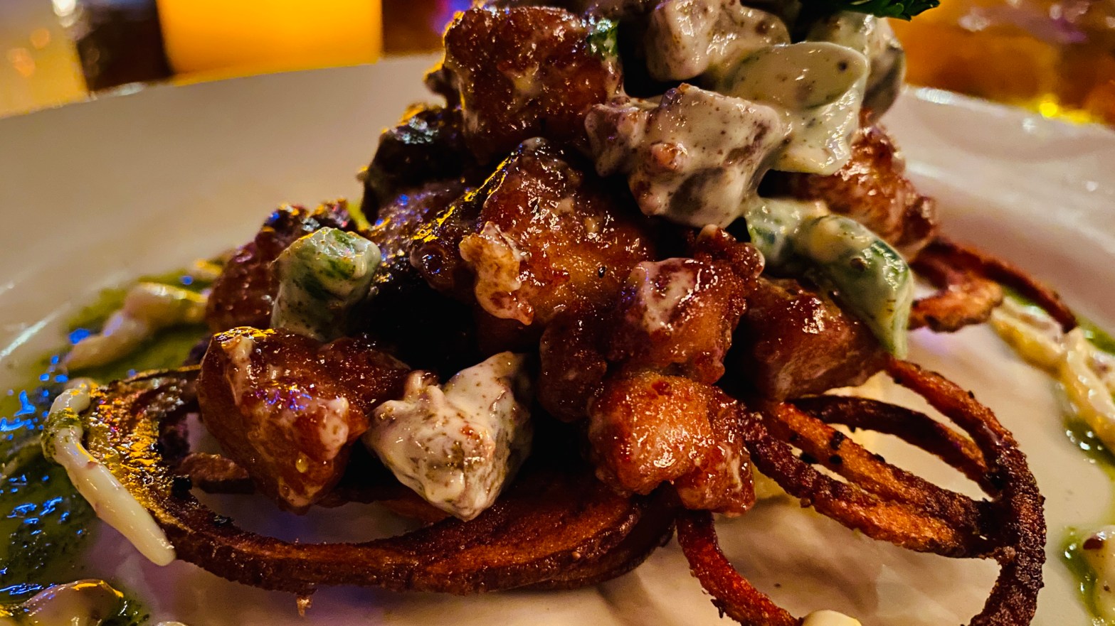 Now onto the sauce, typically I can Figure out exactly what is in a Sauce just buy one bite. This sauce has me mesmerized, there is some kind of acidity in the sauce and it just brings out the perfect butter sensation without being too rich. You will not be expecting this flavor, but it goes so so so perfectly with the dish. A deep brown sauce that is rich and delicious yet acidic and crisp at the same time. There is a slight essence of bbq flavor profile that starts to build but then is tapered off by buttery acidic notes that leaves you with the perfect umami experience.
