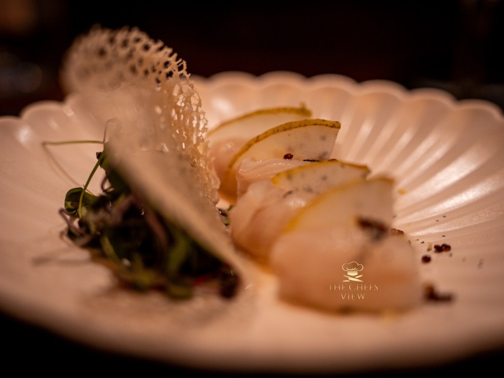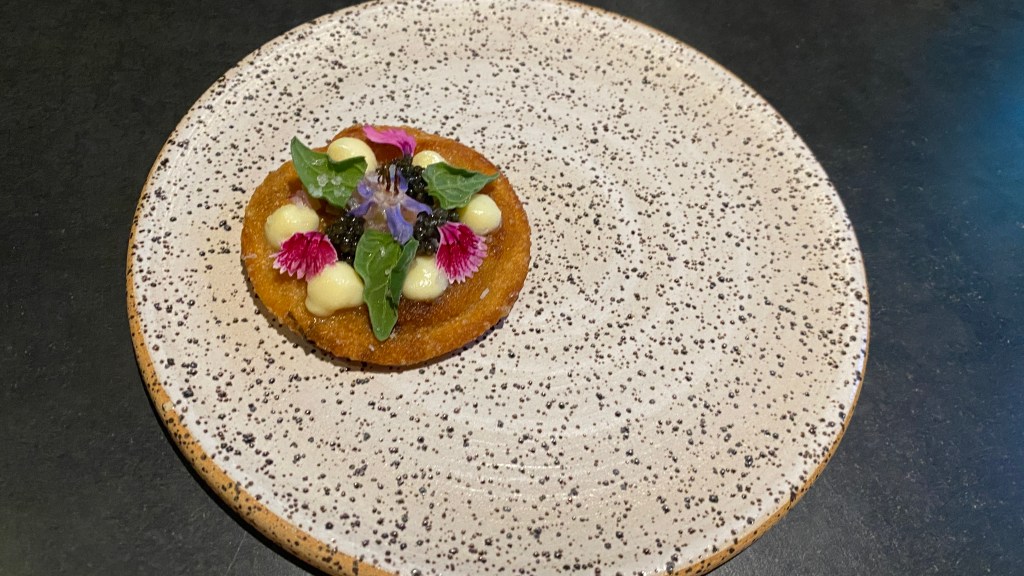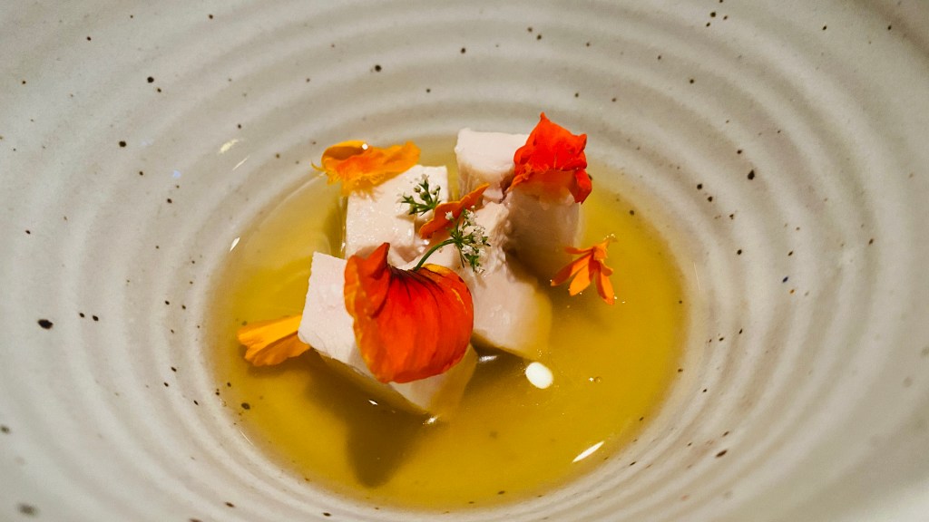 The fermented miso broth had deep umami characteristics that just soared to ultimate heights flowing with the freshness of the local bean. As a farm to table aficionado I appreciate a simple dish like this. It was simple yet elevated with flavor pearls and edible flowers. The flavor pearls lacked flavor and were bland but it was a good idea. The beans were undercooked but I am assuming they wanted you to feel the depth of the fresh bean. This dish was ok, and gave me hope that the meal would get better.
