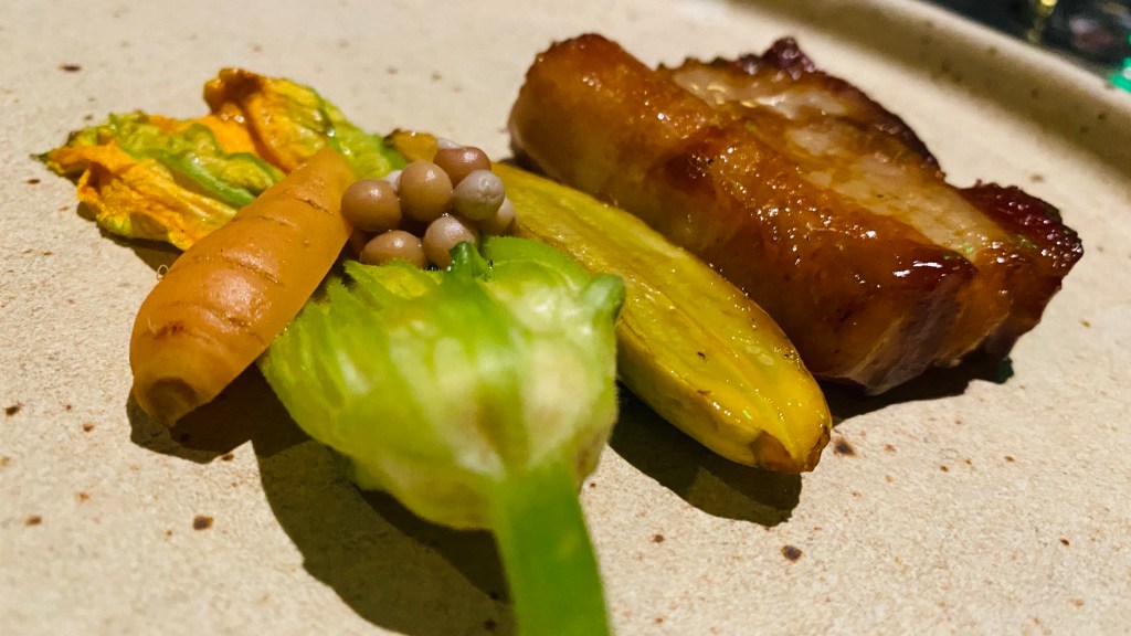 The pork belly was delicious! It melted in your mouth and had the buttery feel that pork belly should. If only it was three times the size! The squash blossom was not stuffed with anything and was literally a raw squash blossom with cold, barely pickled carrots and okra seeds. Maybe I am being too critical at this stage but I am not a huge fan of cold items with my meat. On such a small dish, and with such delicious pork belly, make it a symphony, not just a star of a show with some local items thrown on the plate. I get wanting to cut the fat with something but this didn’t work at all.