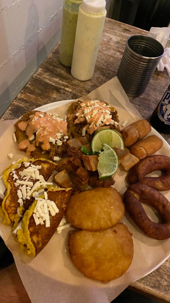 Appetizer Sampler for $21 – Little Venezuelan samples. (2 of each) Tequeños, Mandocas, Mini-Cachapas, Shredded Beef or Chicken Patacones, crunchy Chicharrones (Pork Rinds) and your choice of Mini-Empanadas or Mini-Arepitas.
