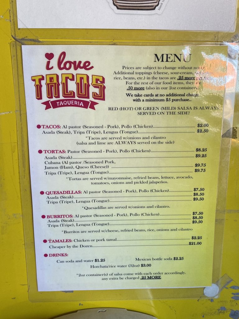 Off of Chestnut and Hwy 44 you will find a taco shack called “I Love Tacos – Taqueria” and be ready for an experience! You walk into a little alcove where a lady greats you and asks what you would like to eat. There is a menu to the left, and a specials board to the right. Along with house made Horchata and an array of Mexican Sodas. I was very impressed that after I ordered my food, they gave me a fancy beeper to let me know when my order was ready, sweet! (you can chill in your car till your food is ready)
