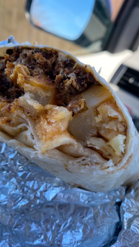 I almost forgot, I also got the breakfast burrito. This thing was huge!!!! Chorizo and eggs with potatoes, what a treat! I will let you in on a little secret, don’t get cheese with this burrito. It just doesn’t need it, the chorizo is so rich and delicious, it just melts in your mouth and you would be trying to battle something, that you can never defeat. Don’t ask me what is in chorizo, because I want you to at least try it or continue eating it, lol. It is truly one of my favorite meats on this planet, what an extraordinary blend of fun spices like cloves, vinegar & cumin!!! You can easily come get one of these burritos and that is all you would need to order, for they are phat!!!