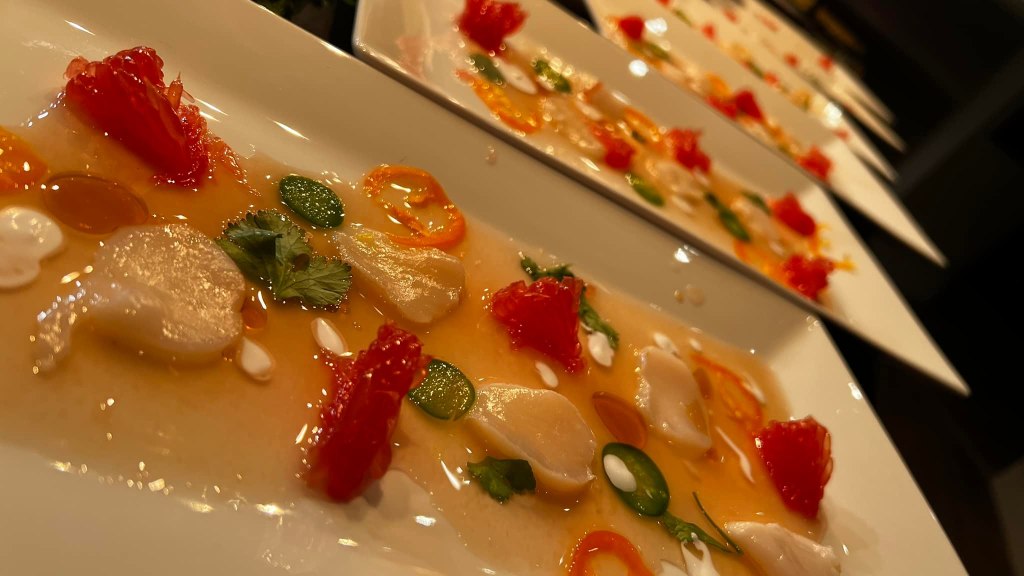 So this dish is exactly what it says it is, a potato with beurre blanc. I will say that the buerre blanc was rich and creamy and even had this heavenly cloud like texture that dissolved over the entire tongue. The saucier was on point that night, kudos. What happened to this poor lonely purple potato in my Nordic Bowl though? Not much flavor, they tell me it is smoked but I don’t taste any smoke. I cut open the potato to see if any magic fairy of flavor is going to sprinkle it with love but no, it’s just a regular potato. At least let that salt absorb into the cavity, or smoke it more heavily to give me a sense of something new. As a chef and food explorer, I just don’t think it is fair to put a bland potato and some sauce and call it a dish.